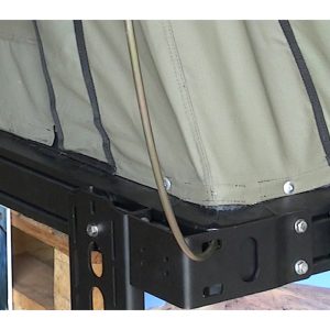 The bracket is made from stainless steel supplied in three parts and comes with with stainless steel bolts and nyloc nuts required for fitment. The two large parts have been designed with a variety of laser cut holes and slots to be able to accomodate most brands of awning, these parts are attached to the side of the tent and can be positioned pointing either up or down depending on your needs and vehicle configuration. If installed in the upward pointing position, the spring steel pole for the tent’s rainfly needs to have an additional ‘dog leg’ bent into it to avoid contact with the awning arms. The corner bracket is installed on the corner of the tent where the hinge of the awning is located to provide additional strength and support for the awning when in use (see image) and is bolted to the rear section of the awning bracket. The bracket can also be use for standard 180 degree awning, in which case the corner section does not need to be fitted.