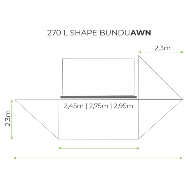 The BunduAwn standard sizes are 2.45m (96 inches), 2.75m (108 inches) and 2.95m (116 inches), which is the length of the back plate. The back plate is the part of the awning that is mounted against your vehicle.
