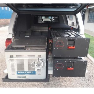 The weight limit inside each drawer is 115Kg. When two drawers are installed side by side, then there is also the option of the Wing set that will double the storage around the drawers and also provide a one level platform within the load box for more storage, as well as the use of a mattress on top to sleep on.