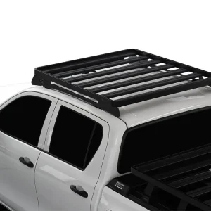 This 1358mm/53.5″ long full-size Slimline II cargo roof rack kit contains the Slimline II Tray, Wind Deflector and 2 Foot Rails to mount the Slimline II Tray to your Toyota Hilux Revo Double Cab. Drilling into the vehicles roof is required to insert mounting hardware, a template is provided for hole placement.