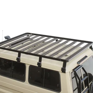 This 1964mm/77.3” long, 3/4 size, Slimline II cargo carrying roof rack kit for the 78 series Toyota Land Cruiser contains Slimline II Tray and Wind Deflector, as well as 8 Gutter Mount Legs for mounting the Tray to the vehicle. This taller kit has space for mounting the Front Runner tables or other compatible accessories under the rack. Installs easily with no drilling required.